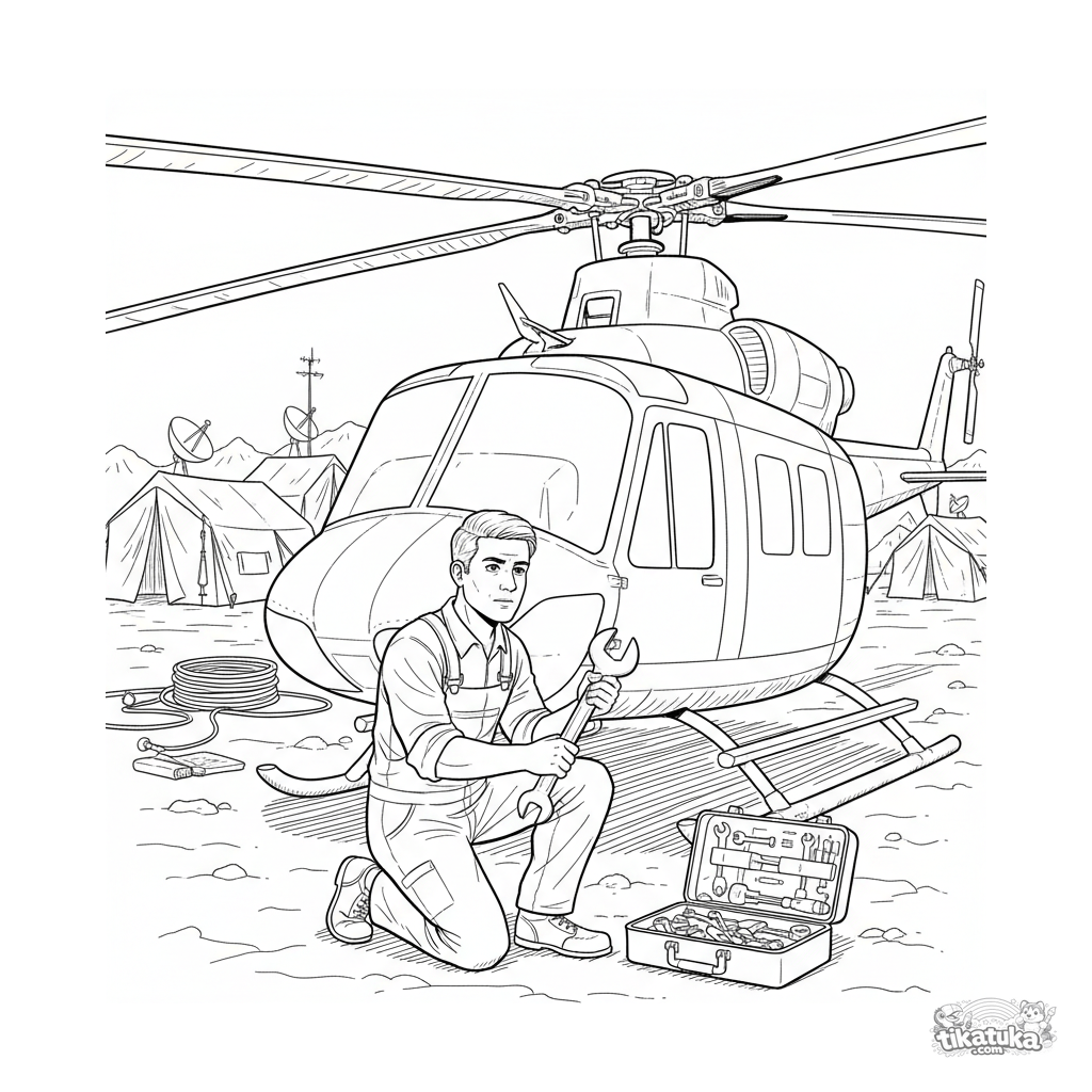 Página para colorear detallada para 10-12 años: un mecánico revisando el rotor de un helicóptero cerca del cuartel general de campaña con carpas.