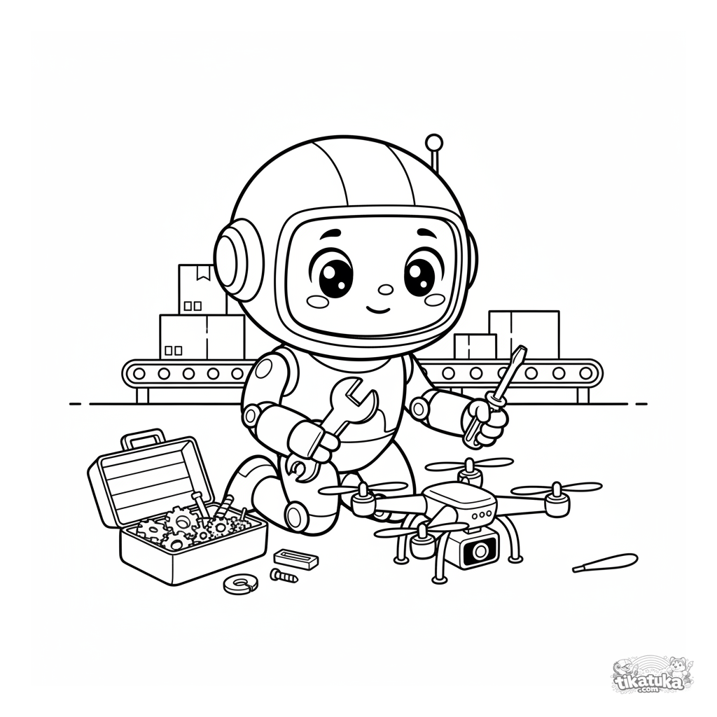 Página para colorear para niños de 7-9 años: un divertido robot ayudante estilo 90 repara un dron roto en el suelo del almacén. Formas expresivas, escena dinámica, detalle moderado.