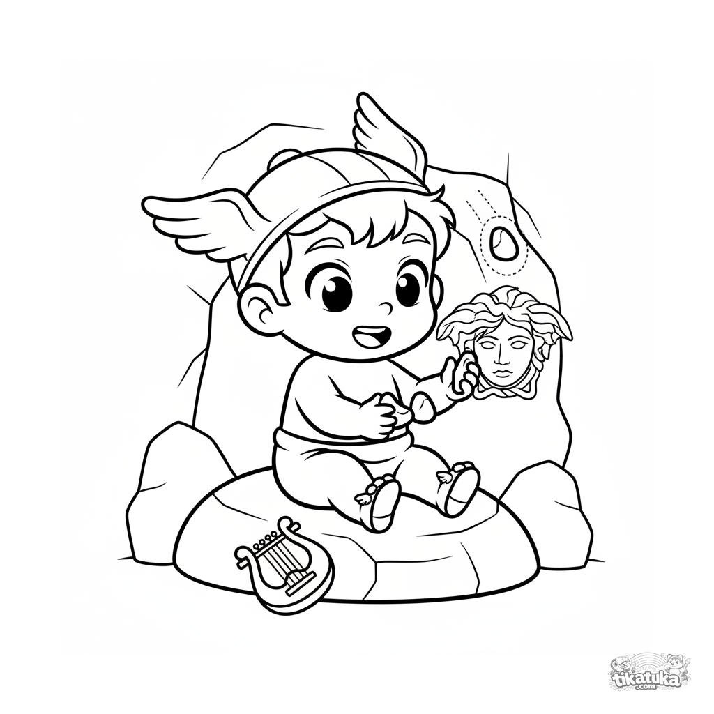 Página para colorear simple estilo anime para niños pequeños 2-3: el bebé Hermes con sandalias aladas juega feliz a las tabas en el suelo.