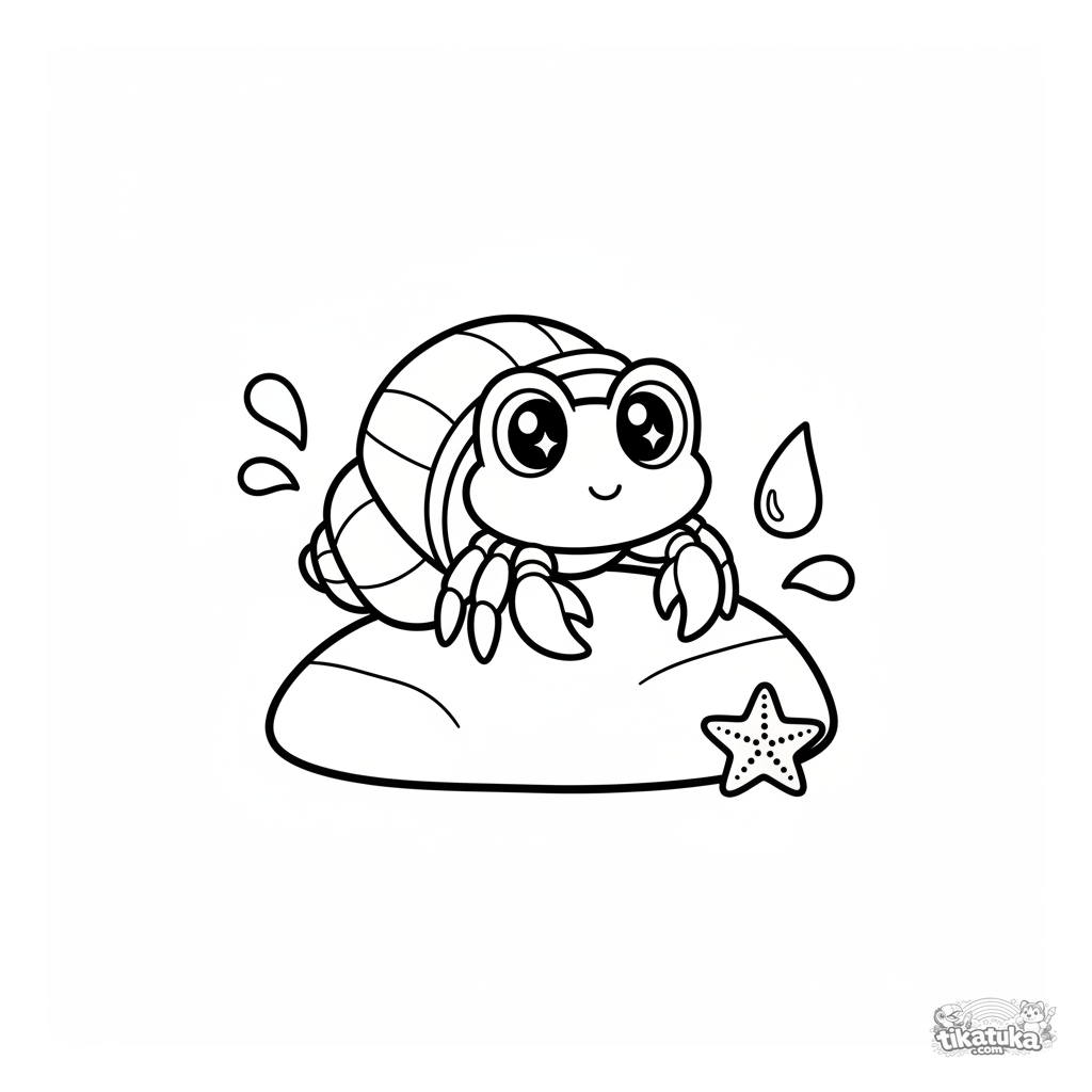 Página simple para colorear para niños pequeños: un cangrejo ermitaño asomándose de su concha en una roca soleada en un charco de marea. Formas grandes, pocos detalles. Para 2-3 años.