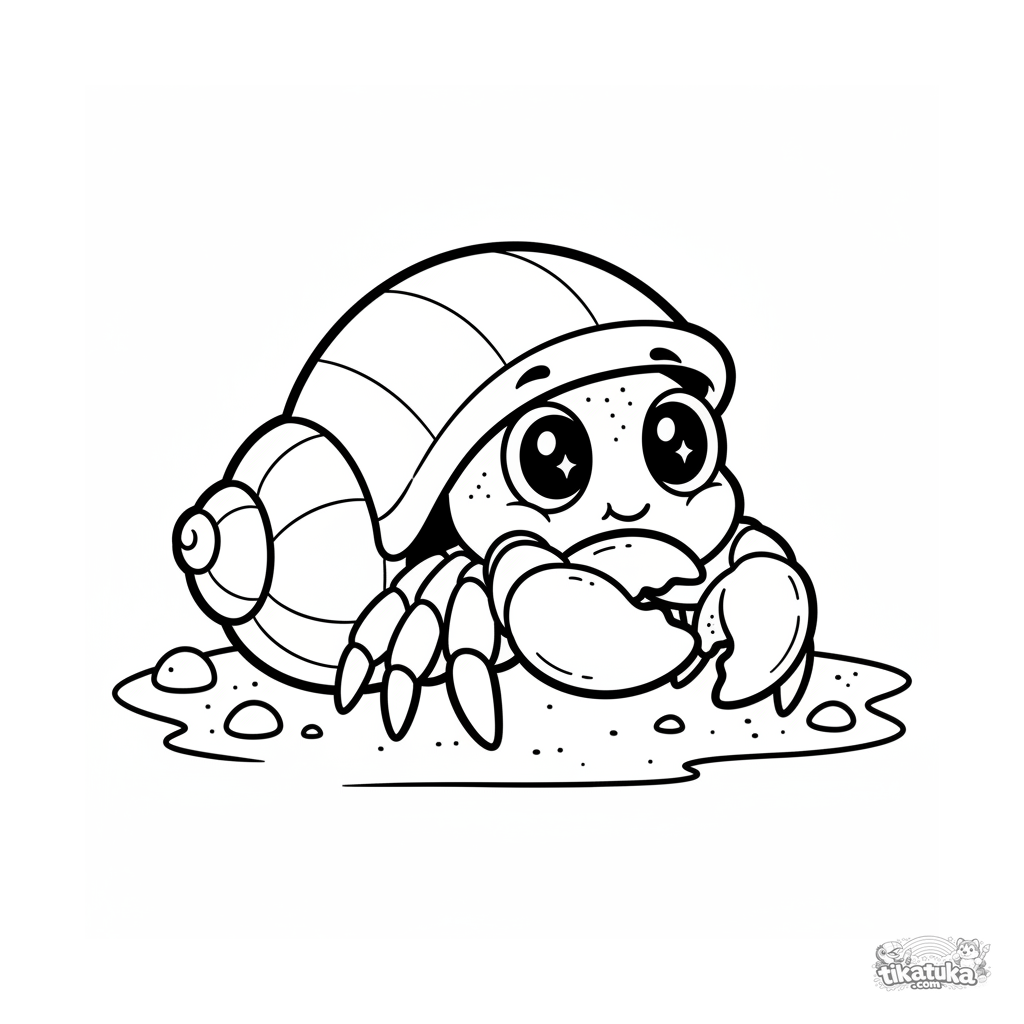 Página simple para colorear para niños pequeños: cangrejo ermitaño asomándose de su concha en arena soleada. Para 2-3 años.