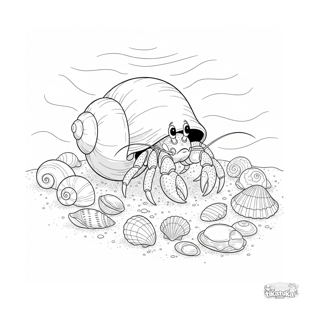 Página para colorear detallada para 10-12 años: Un cangrejo ermitaño eligiendo una nueva casa entre conchas en un fondo marino soleado y poco profundo.