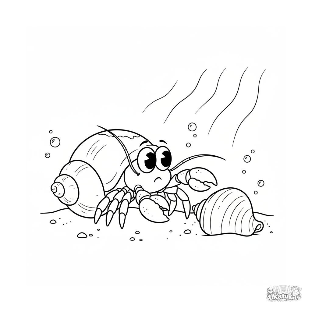 Página para colorear de un cangrejo ermitaño cambiando su concha en un rayo de sol en el fondo arenoso. Escena detallada para niños de 7 a 9 años.