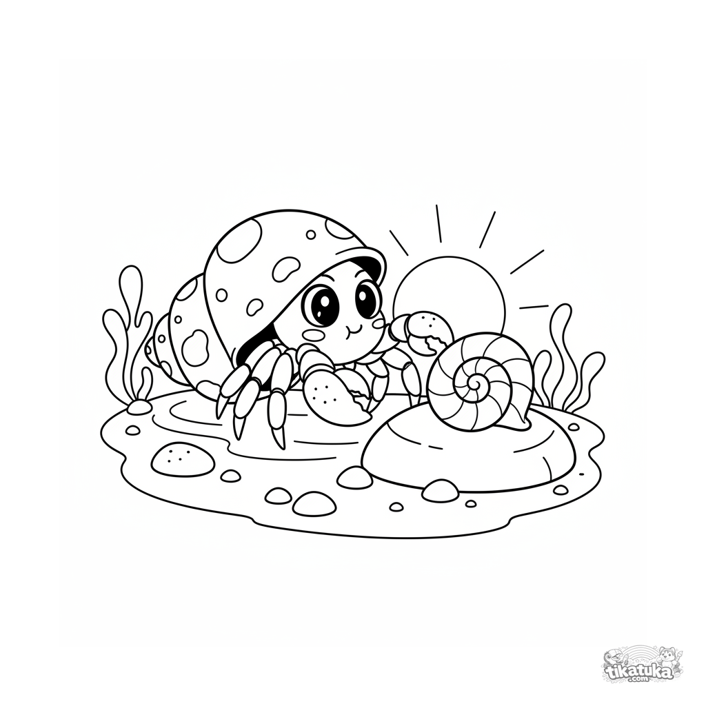 Página para colorear de un cangrejo ermitaño cambiando de concha en una charca de marea soleada. Escena detallada para niños de 7 a 9 años.