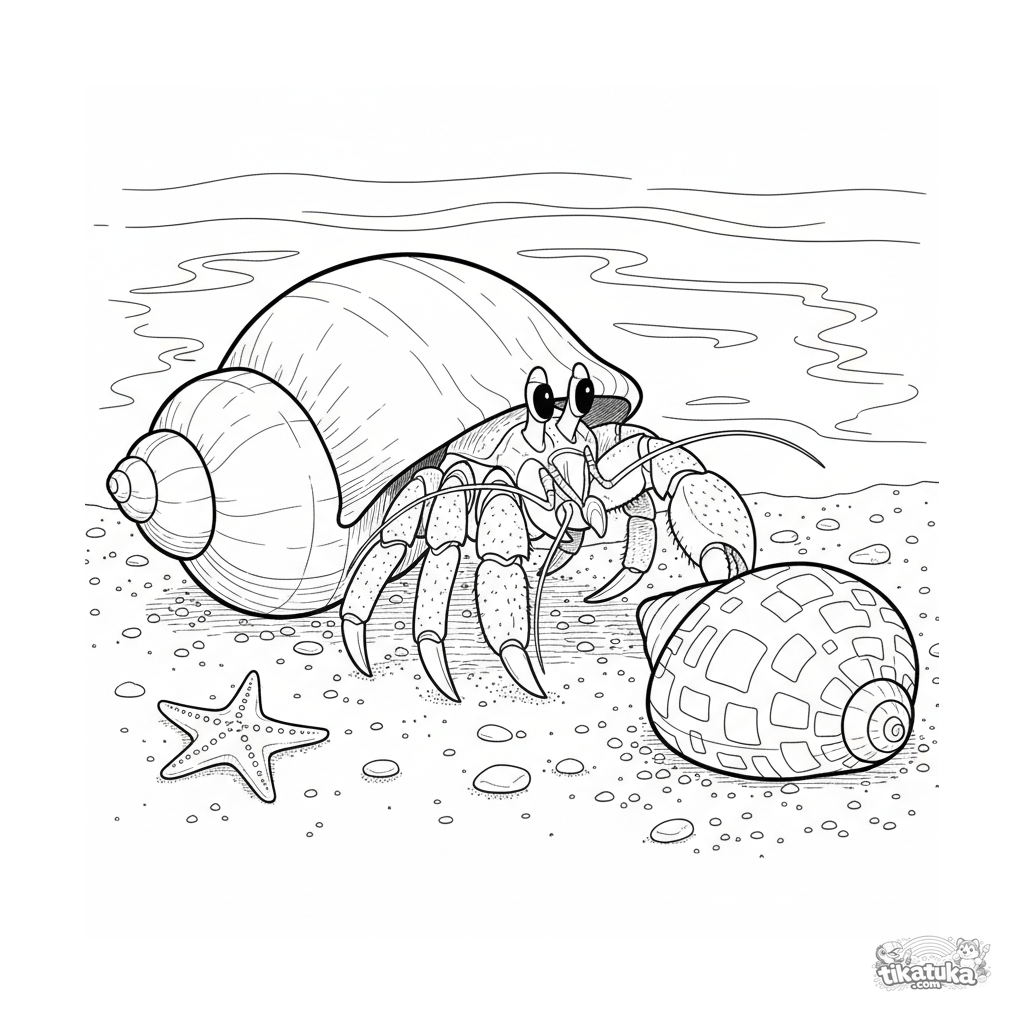 Página para colorear detallada de un cangrejo ermitaño cambiando de concha en el fondo arenoso bajo rayos de sol. Para niños mayores de 10-12 años.