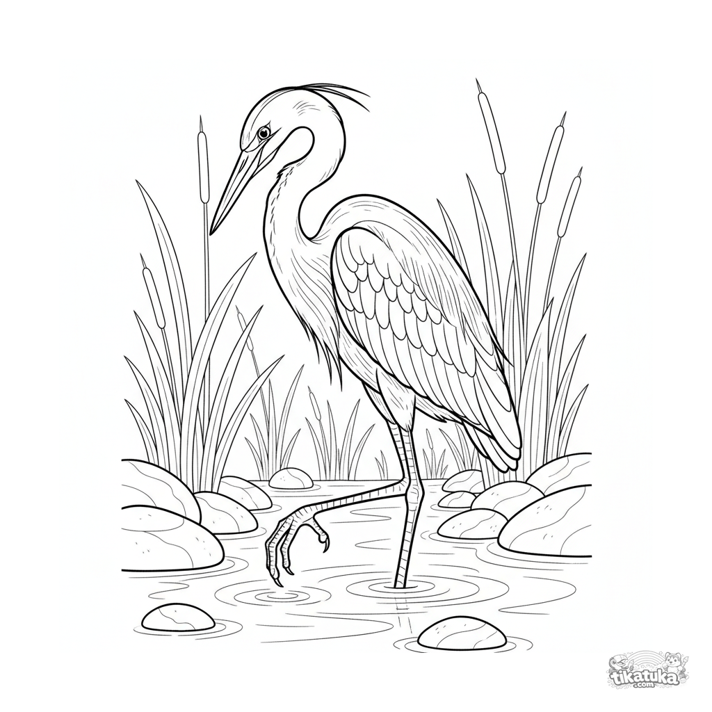 Página para colorear realista para 10-12 años: una garza gris quieta en el agua clara de un arroyo, cazando peces. Ilustración detallada de un pájaro en su hábitat.