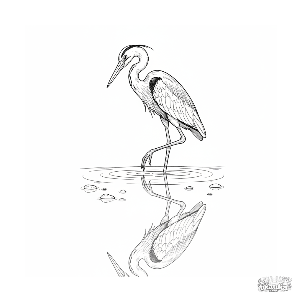 Página para colorear intrincada para niños de 10-12 años: una garza parada en el agua clara de un arroyo. Estilo grabado vintage, con detalles de reflejo.