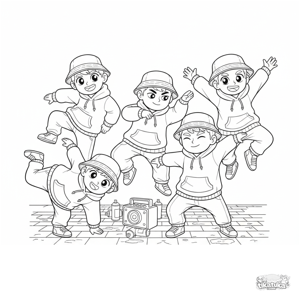 Página para colorear para niños de 7-12 años: una crew de hip-hop bailando en un callejón de ladrillos. Escena dinámica con ropa detallada, altavoz y latas de spray.