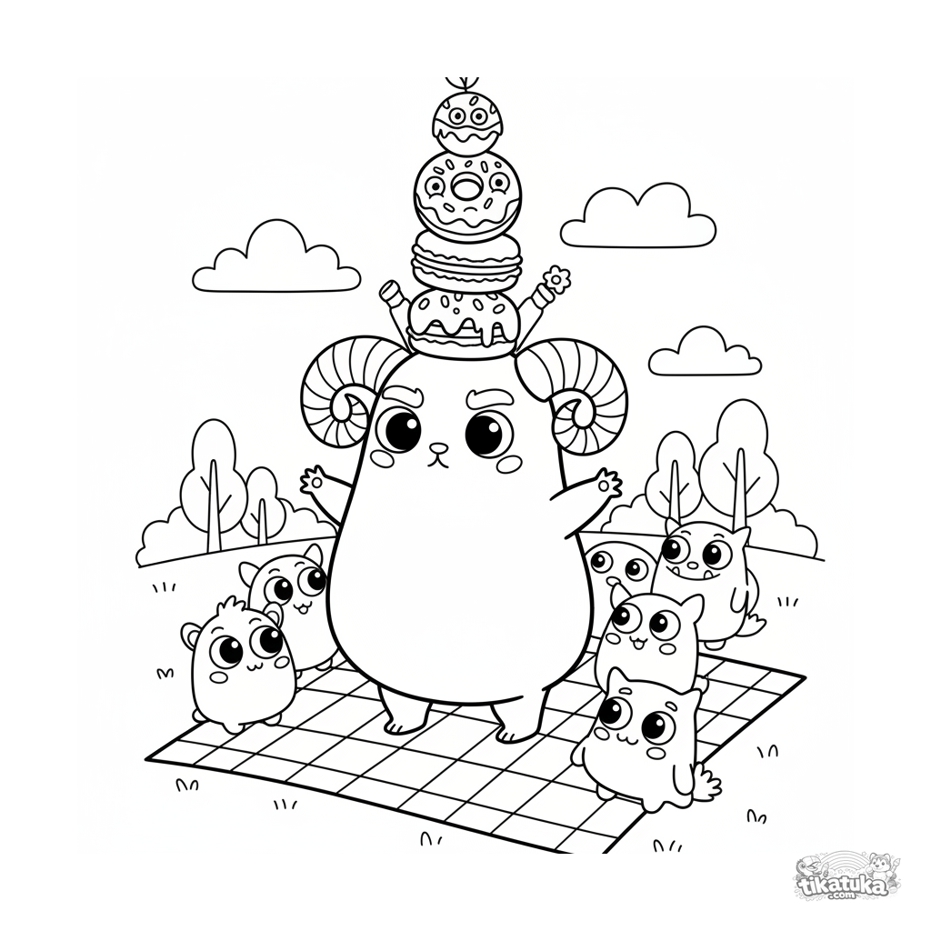 Página para colorear para niños 7-9: un monstruo con cuernos en estilo folk equilibra una torre de dulces. Escena divertida y expresiva.