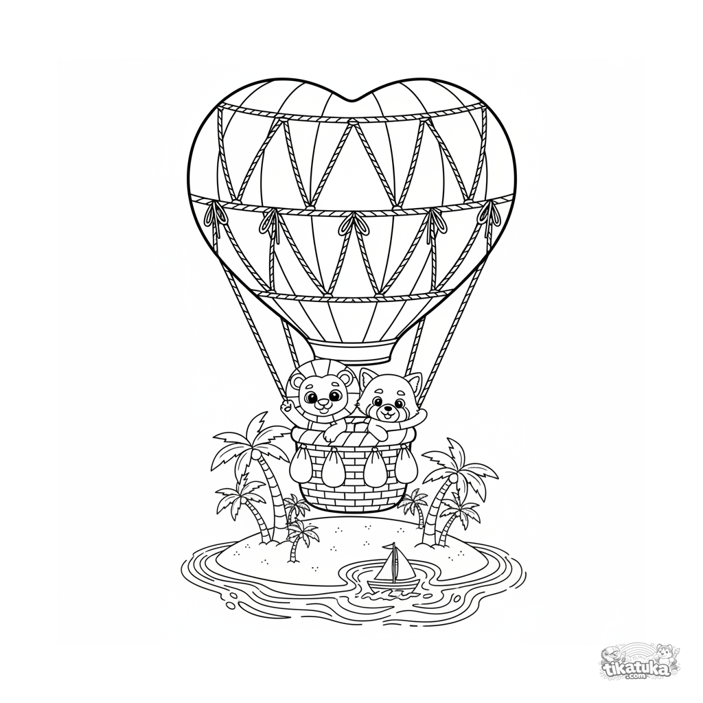 Página para colorear para niños 4-6: un globo aerostático en forma de corazón flota sobre una isla tropical idílica. Líneas suaves, atmósfera de cuento.