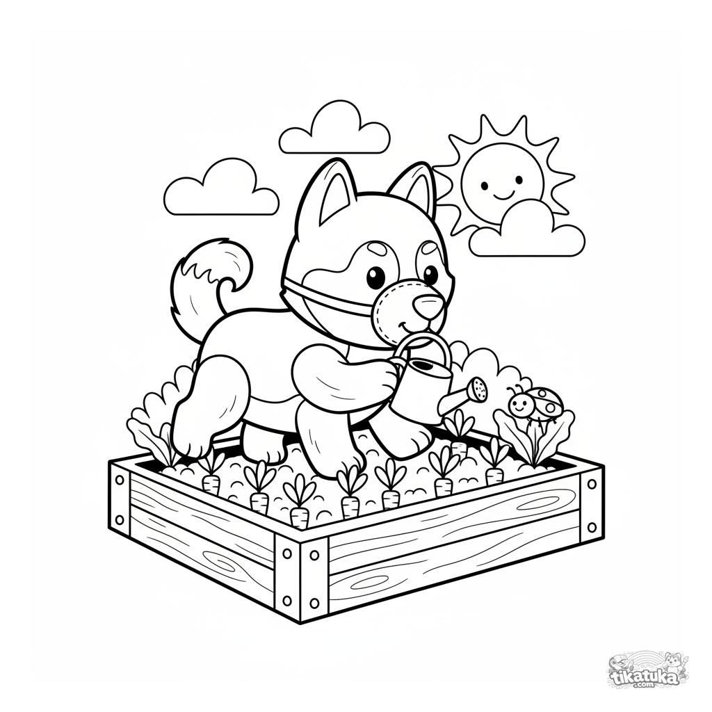 Página para colorear para niños: El cachorro husky Lutik ayuda a regar plántulas en una huerta ordenada. Escena de ayuda linda, formas simples.