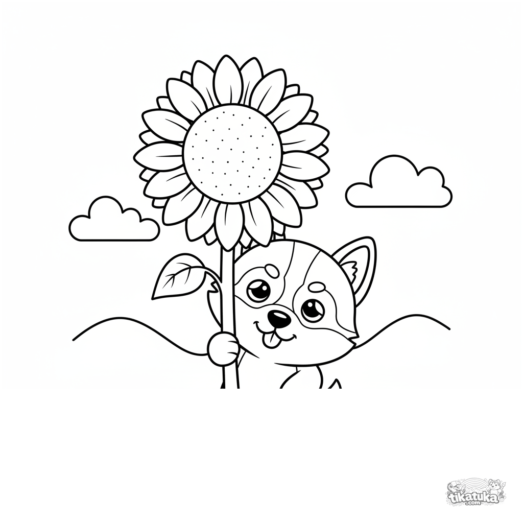 Página para colorear para niños: un cachorro husky juega al escondite, asomándose detrás de un alto girasol en un campo. Escena divertida.