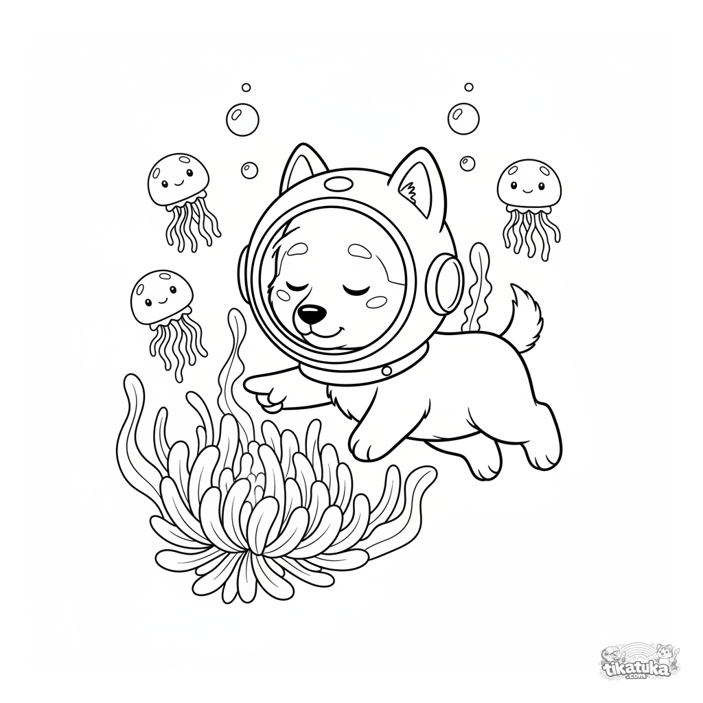 Página para colorear para niños 4-6: Husky Lutik con un casco de buceo nada entre medusas en las profundidades del océano. Escena submarina tranquila y mágica.