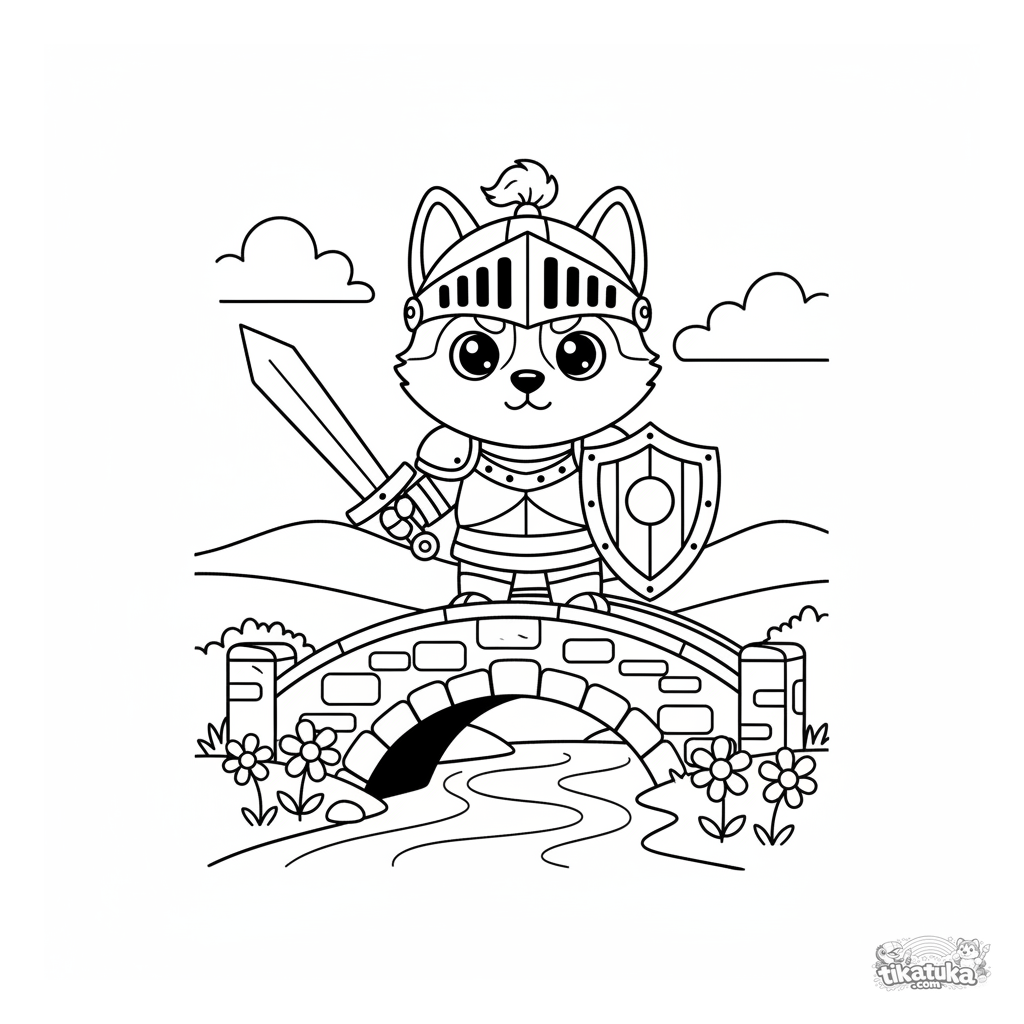 Página para colorear para niños: un husky caballero en armadura guarda un puente de piedra. Pose dinámica, fondo simple, para 5-9 años.