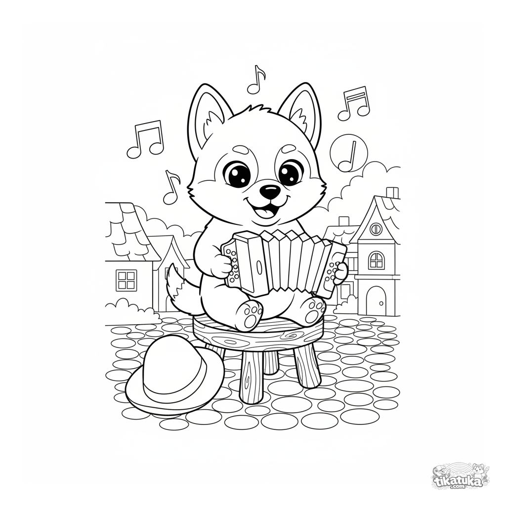 Página para colorear música: un husky toca el acordeón en una plaza del pueblo. Notas musicales alegres, fondo simple, para 5-10 años.