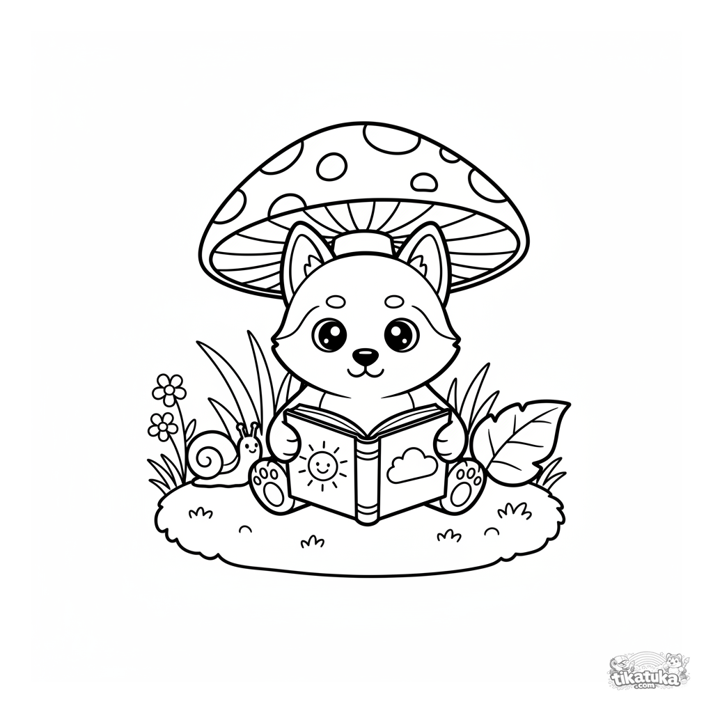 Página para colorear para niños 4-6: un cachorro husky lee un libro bajo una gran seta en el bosque. Líneas simples, escena tierna.