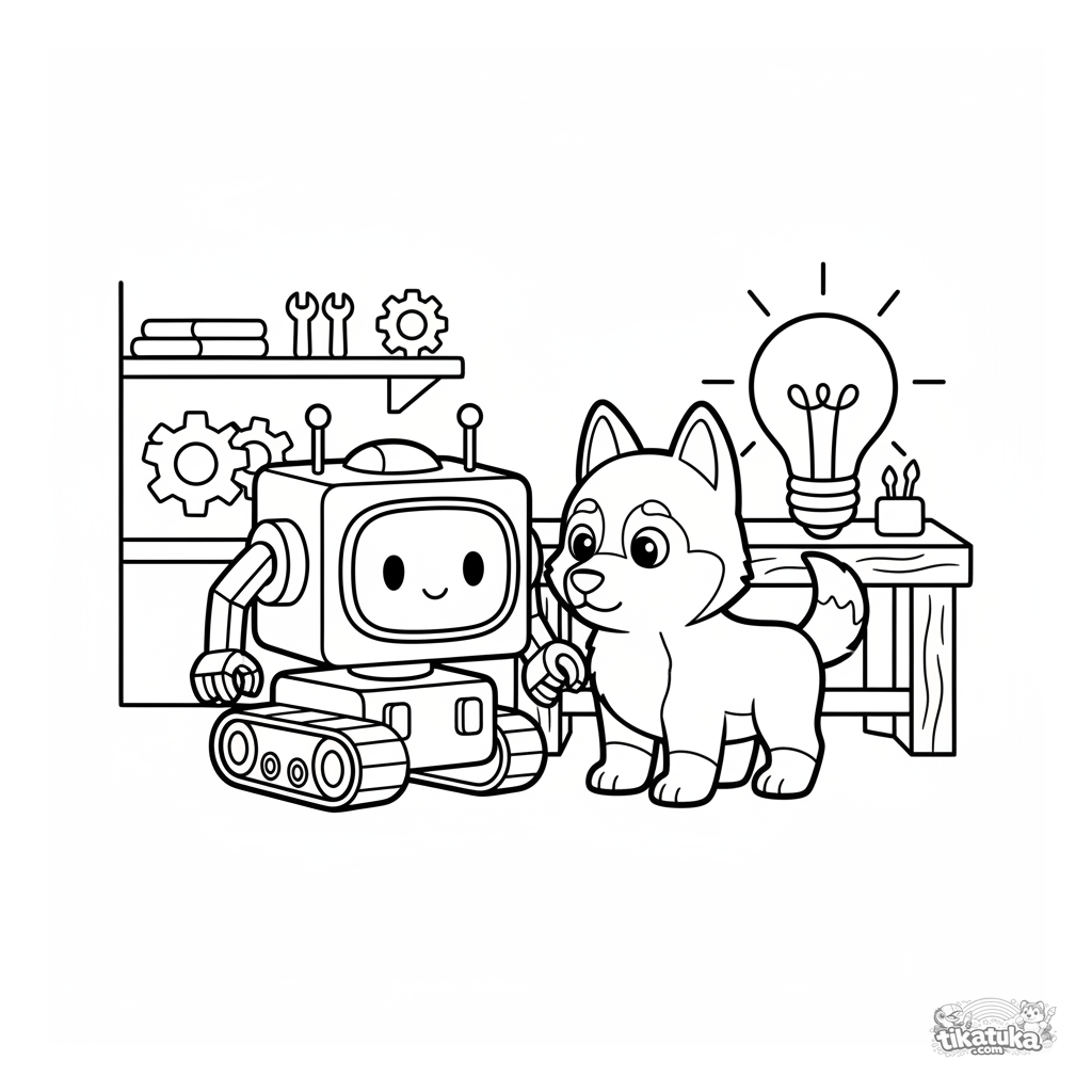 Página para colorear para niños pequeños: Husky Lutik y un robot amigable en un taller acogedor. Formas grandes y simples, pocos detalles, para 2-3 años.