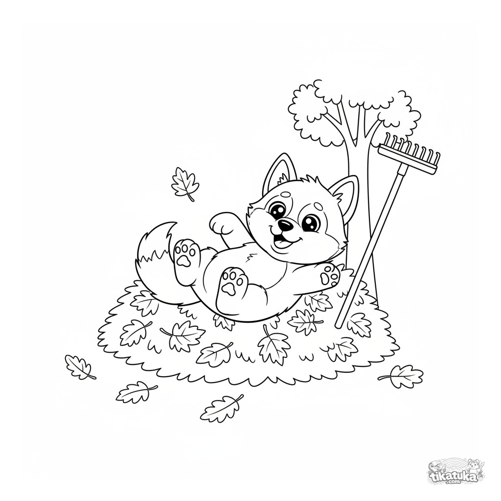 Página para colorear para niños 4-6: El cachorro husky Lutik rodando feliz en un montón de hojas de otoño en el bosque. Líneas simples, personaje lindo.
