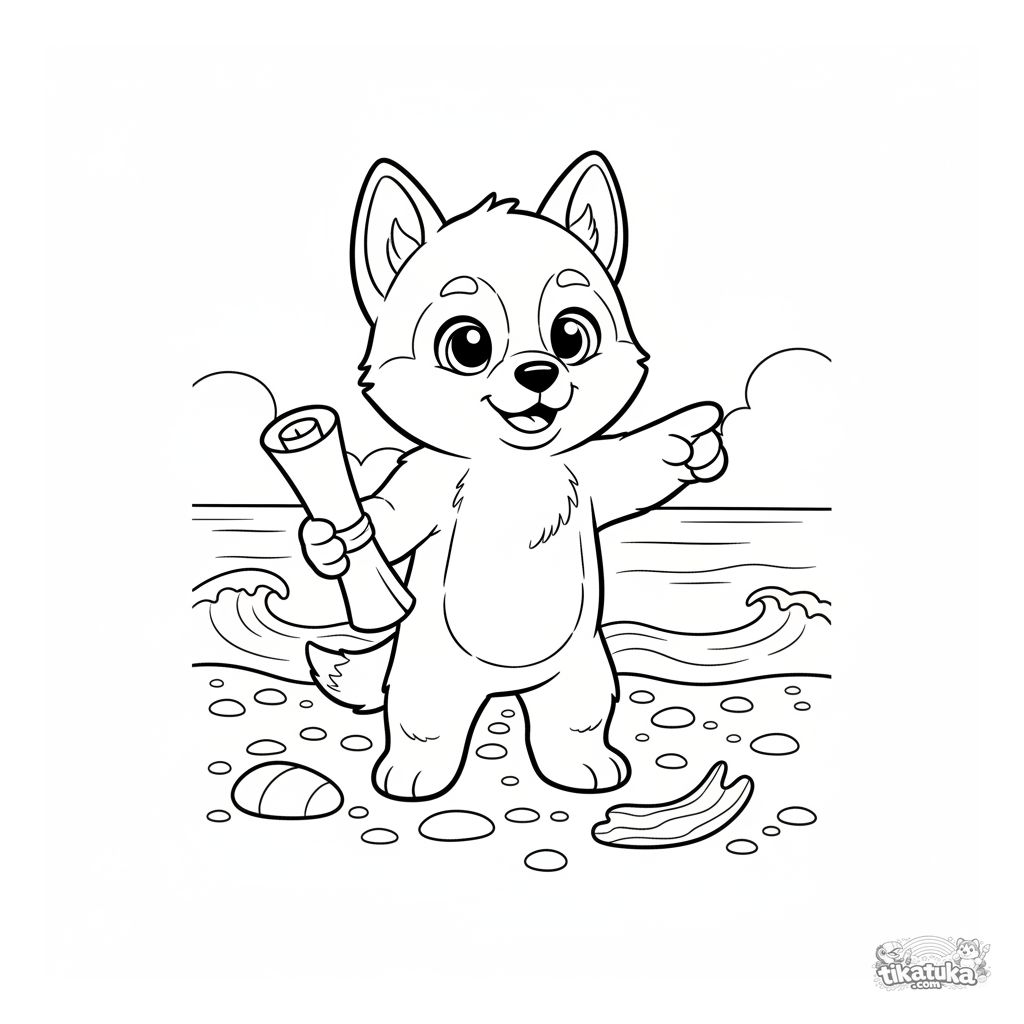 Página para colorear para niños: un cachorro husky explorador con un mapa del tesoro en una orilla rocosa. Escena emocionante y simple.