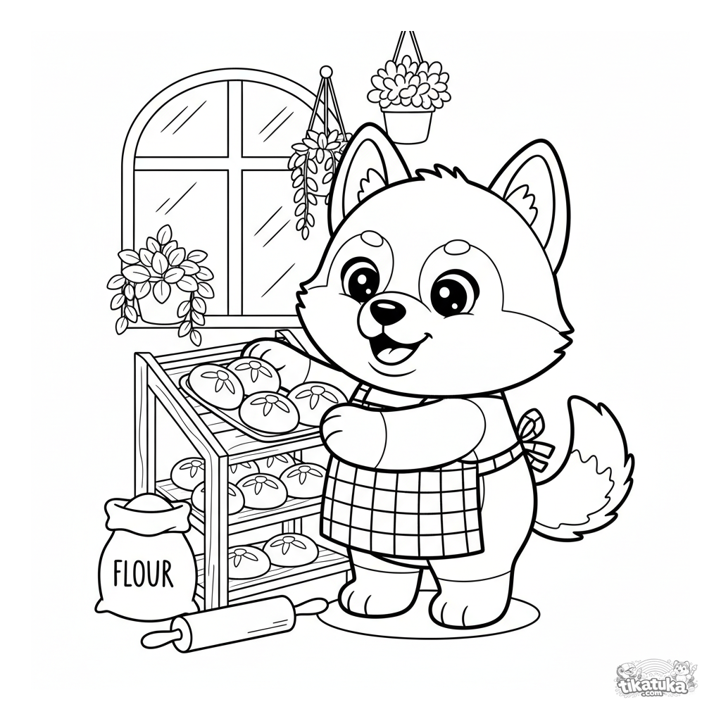 Página para colorear de un pastelero husky para niños de 4-6 años. Un lindo cachorro de peluche con delantal coloca bollos en una panadería.