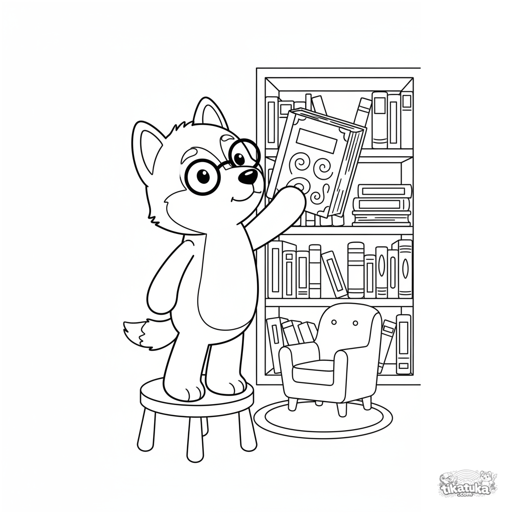 Página para colorear con un bibliotecario husky. Dibujo para niños de 4-6 años. Un cachorro de peluche colocando libros en una estantería de biblioteca.