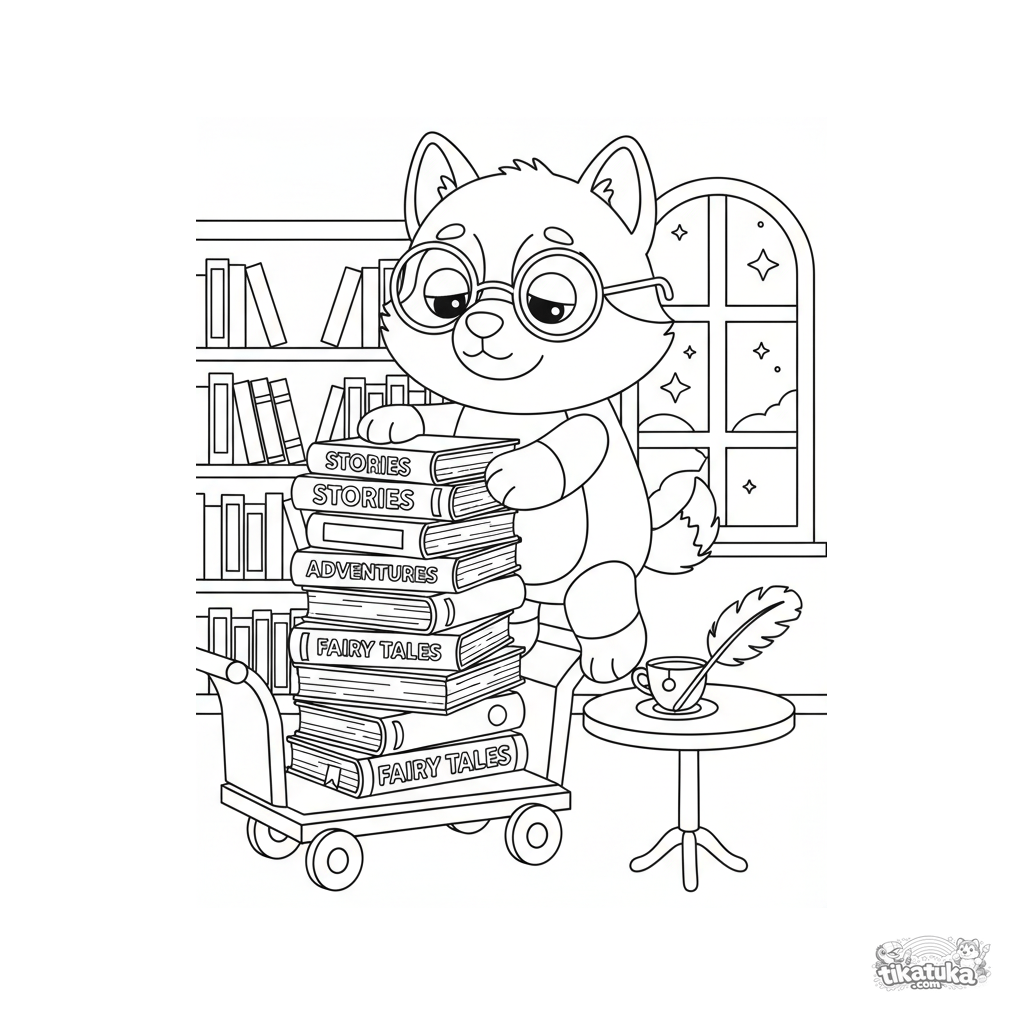 Página para colorear de un bibliotecario husky para niños. Un cachorro de peluche con gafas apila libros. Escena acogedora en la biblioteca.