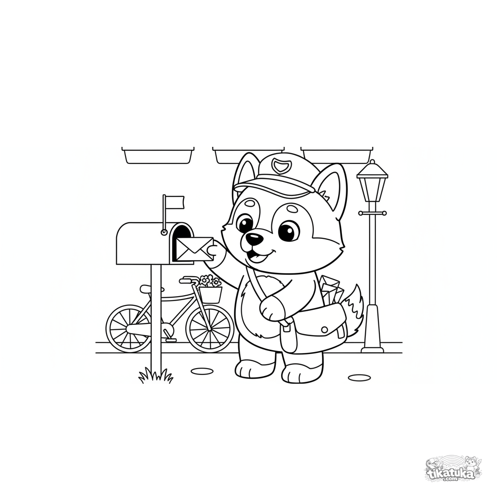 Página para colorear con un cartero husky. Dibujo para niños de 4-6 años. Un cachorro de peluche entregando cartas en un buzón de la calle.
