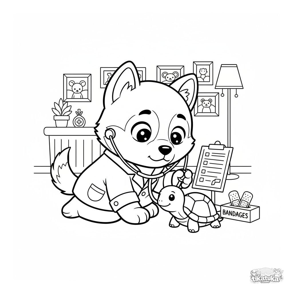 Página para colorear de un veterinario husky para niños de 4-6 años. Un cachorro con bata blanca escucha a una tortuga con un estetoscopio.