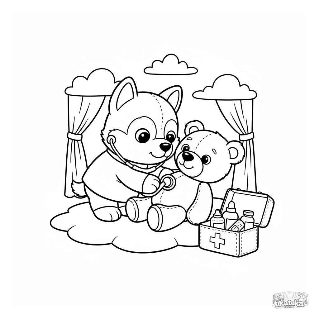 Página para colorear de un veterinario husky para niños. Un cachorro de peluche en bata blanca trata a un oso de peluche.