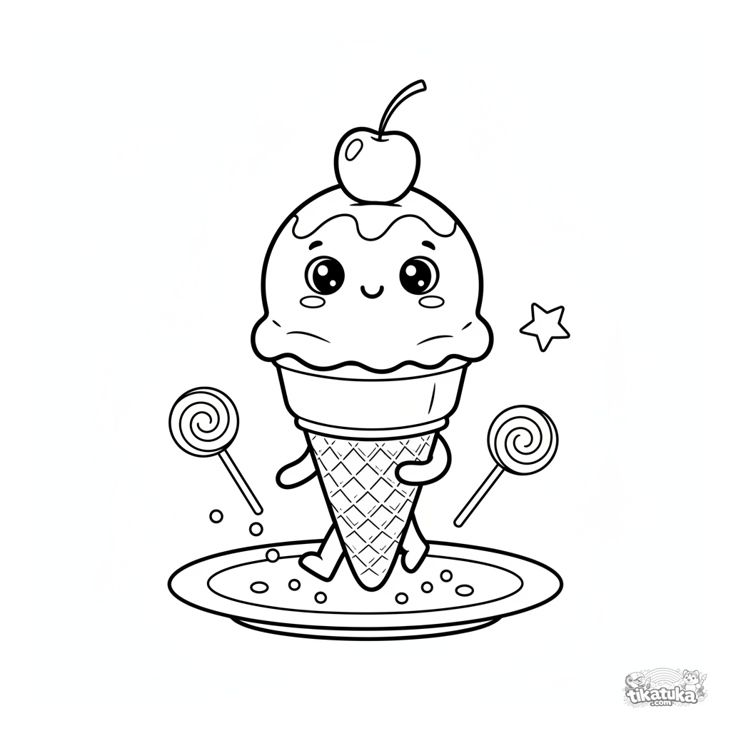Página para colorear para niños: una bola de helado en un cono marcha por un plato. Escena divertida con chispas y una cereza para niños de 4 a 6 años.