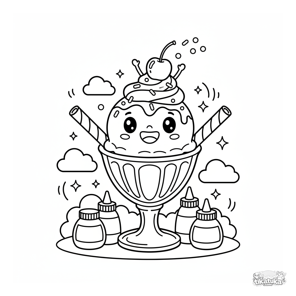 Página para colorear de un sundae de helado celebrando en una barra de café. Para niños de 4 a 6 años. Con brazos de galleta, una cereza lanzando chispas y botellas de sirope.