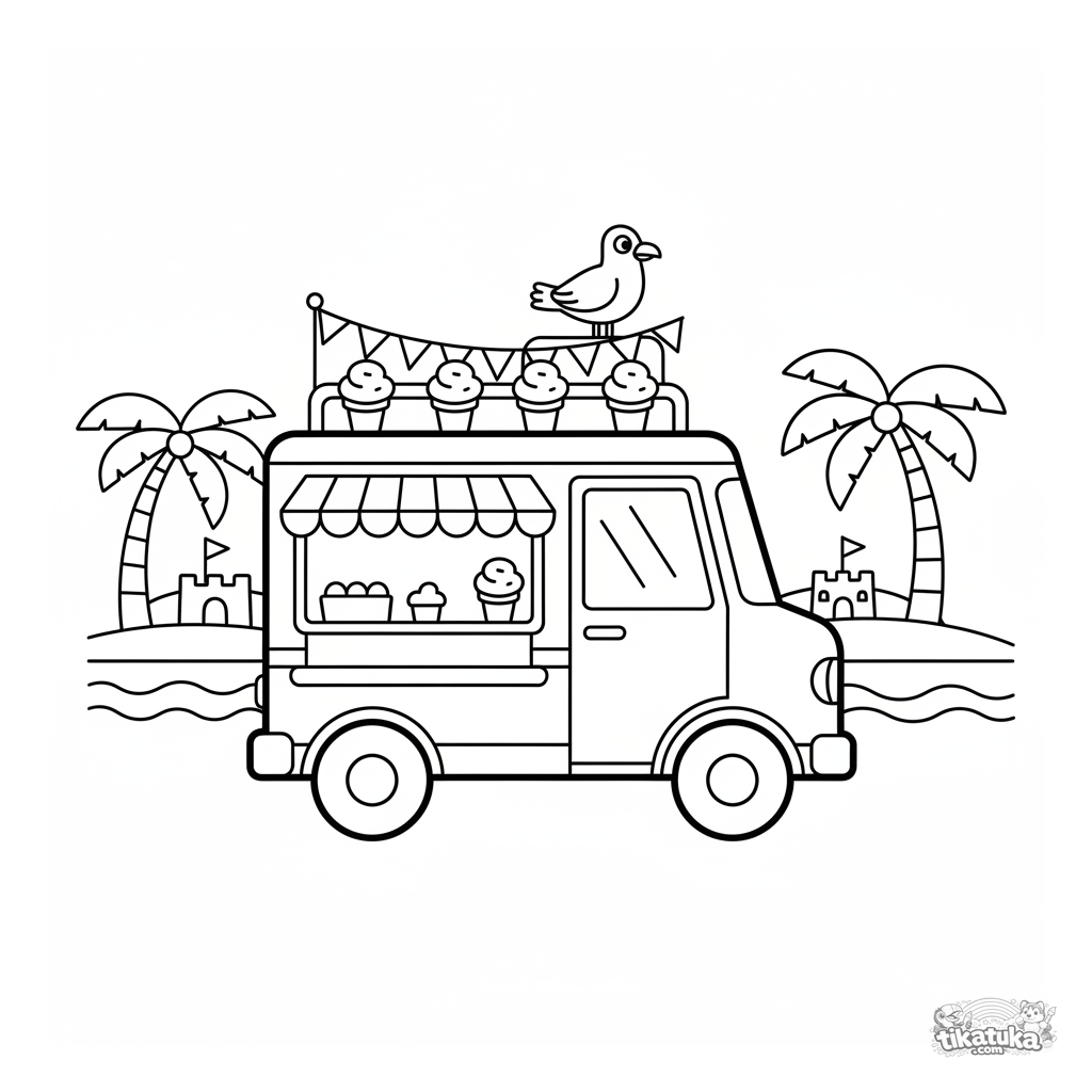 Página muy simple para colorear para bebés 2-3 años: un camión de helados feliz está estacionado en la playa. Formas enormes y simples, perfectas.