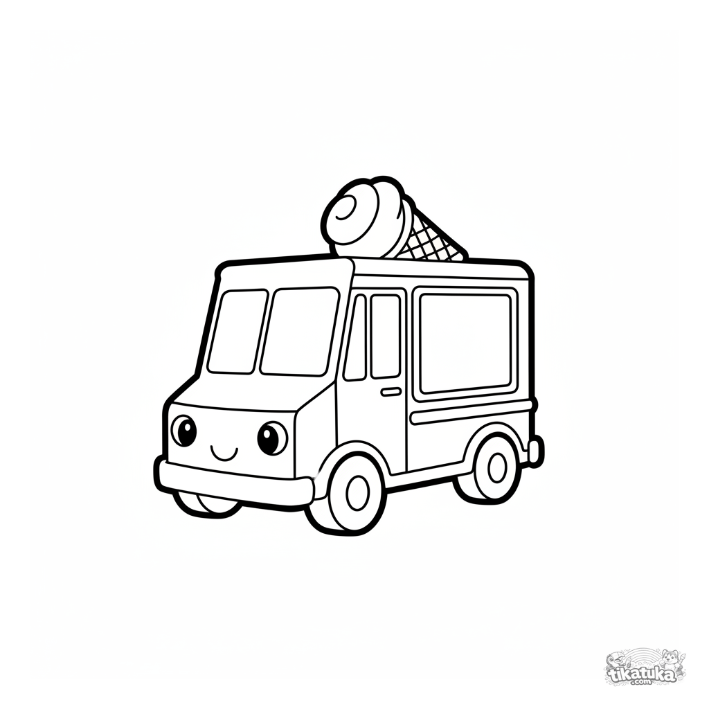 Página para colorear para niños: un camión de helados feliz. Para niños de 4 a 6 años. Diseño de vehículo simple, márgenes amplios, expresión amigable.