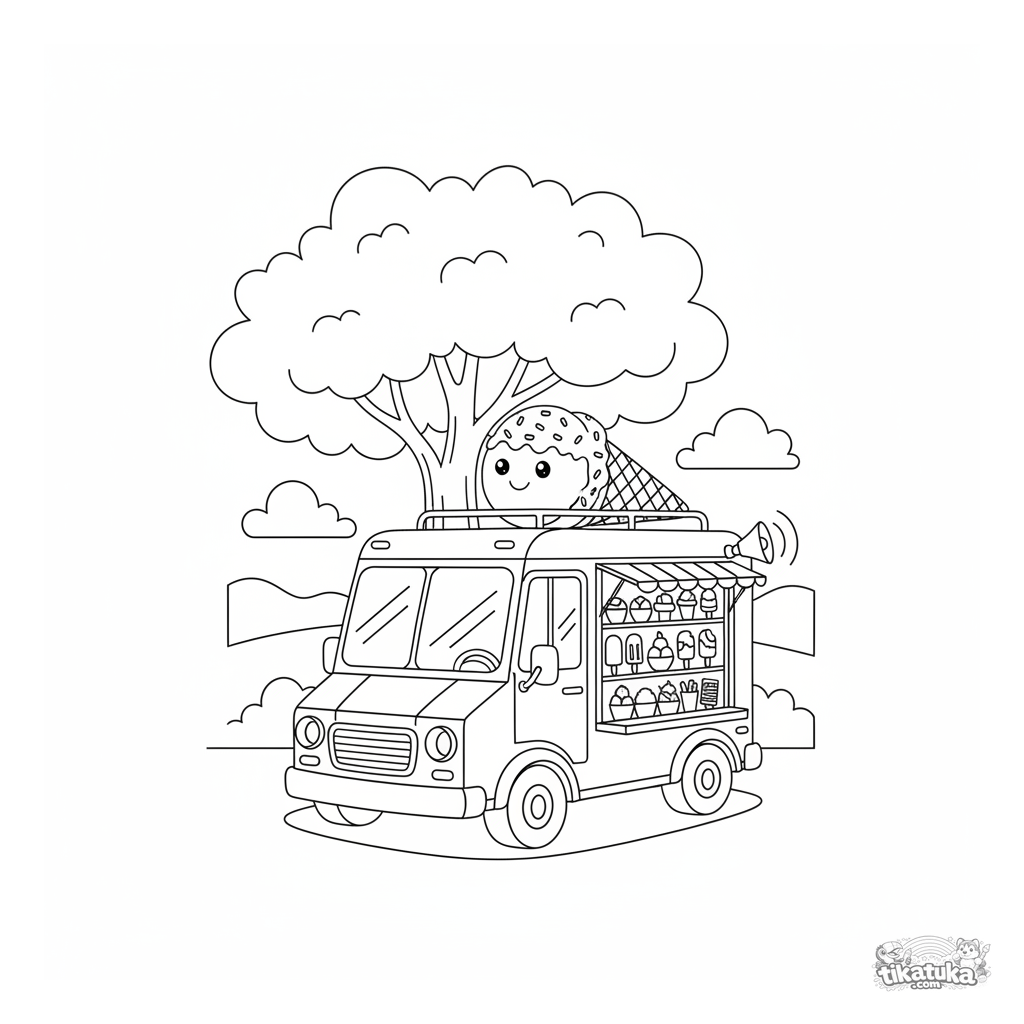 Página para colorear para niños de 4 a 6 años. Un alegre camión de helados con un cono sonriente en el techo. Escena veraniega y apetitosa.