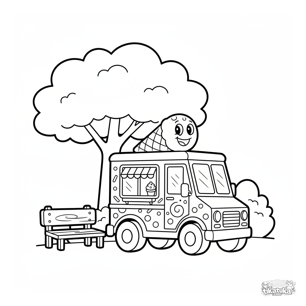 Página para colorear para bebés: un camión de helados alegre en el parque. Forma simple del vehículo con un gran helado encima.