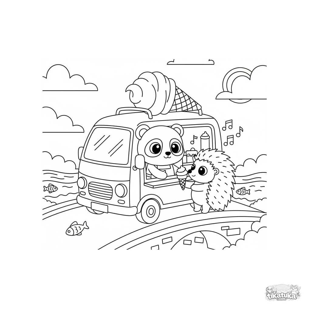 Página para colorear para 7-9 años: una furgoneta de helados en un puente, un vendedor panda sirviendo a un erizo. Escena tierna y amable.