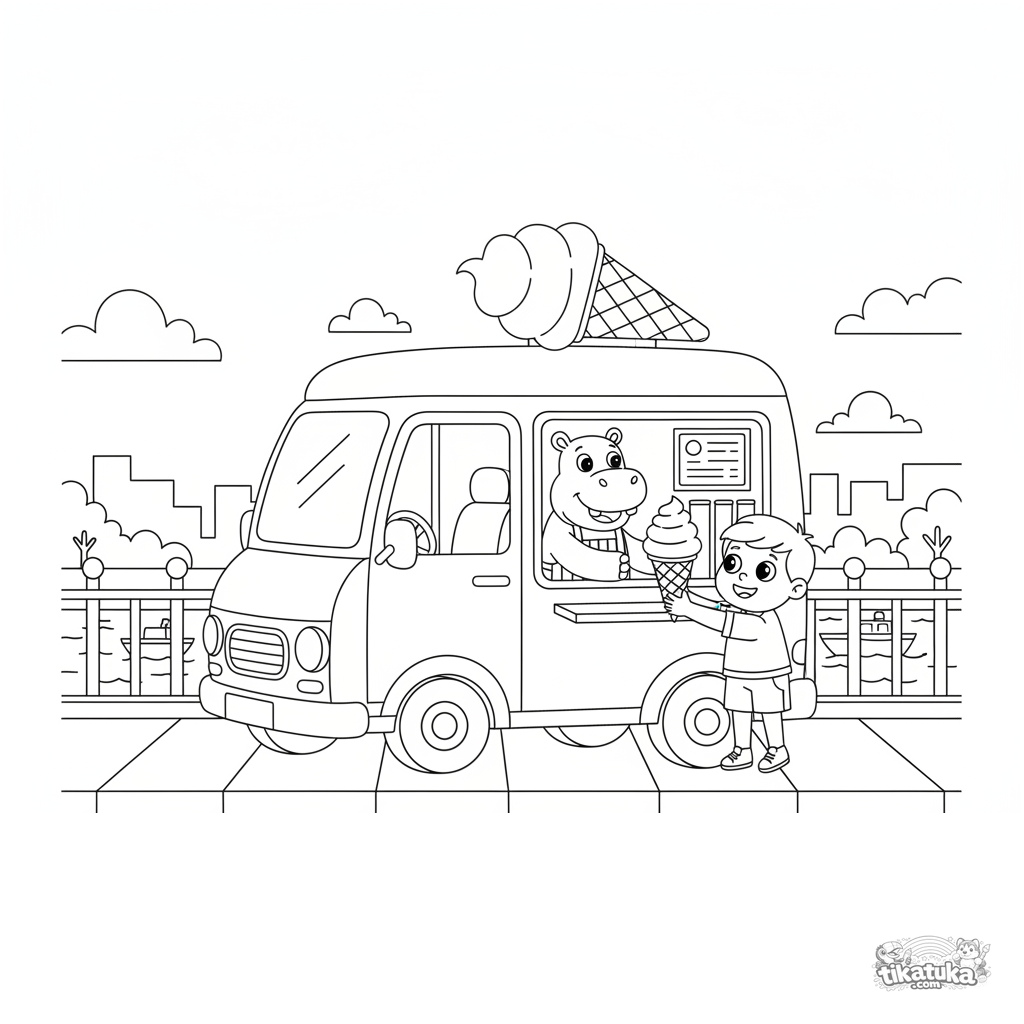 Página para colorear para niños 4-6: una alegre furgoneta de helados está aparcada en la acera de un puente sobre un río. Un vendedor hipopótamo amistoso atiende a un niño. Formas claras, escena agradable.