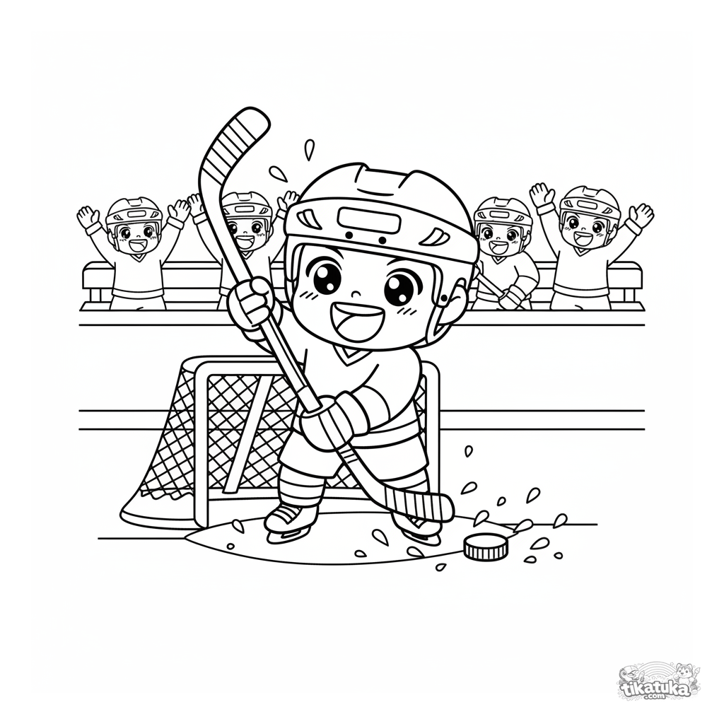 Página para colorear: un jugador de hockey celebra anotar un gol en la pista de hielo. Ideal para 4-6 años, escena llena de acción y emoción.