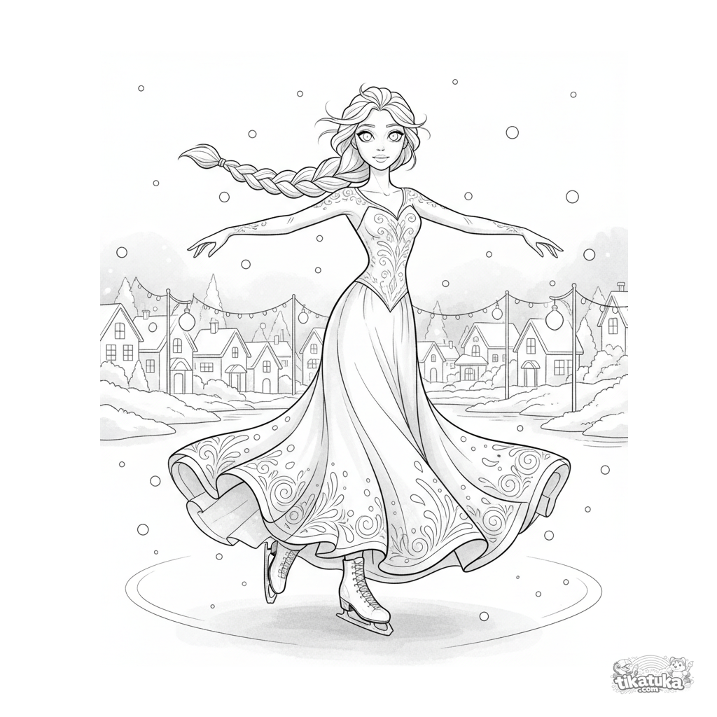 Página para colorear detallada para niños de 10-12 años: una princesa de hielo en vestido con patrones de escarcha patina elegantemente en un lago helado.