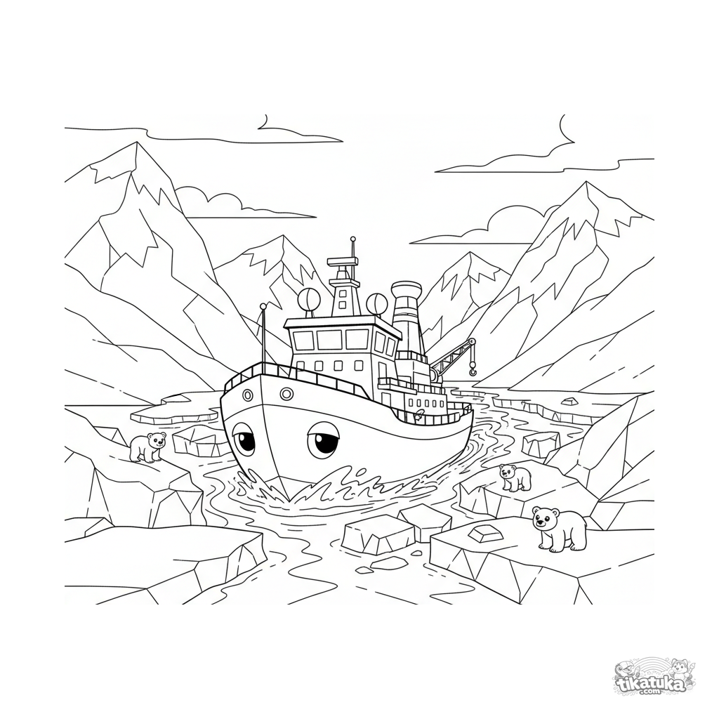 Página para colorear para niños de 4-6 años: un rompehielos poderoso abriéndose paso entre el hielo. Formas geométricas y escena interesante.