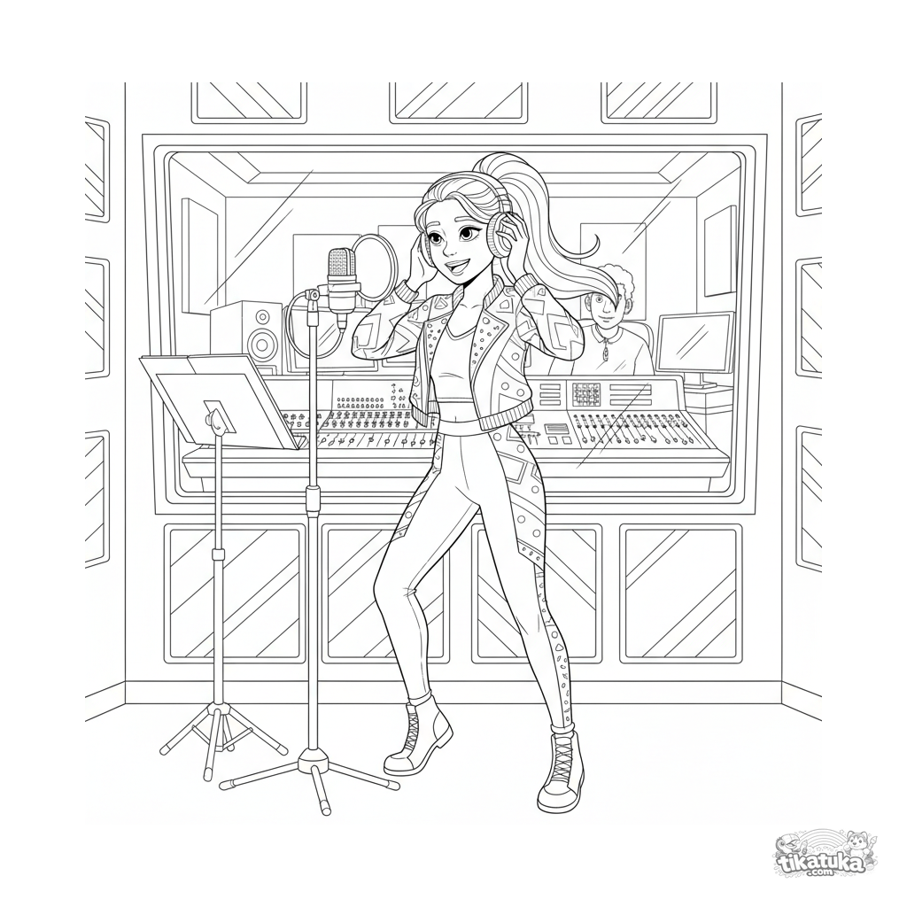 Página realista para colorear anime: una cantante ídolo ensaya en un estudio de grabación profesional. Alto detalle para 10-12 años: consola de mezclas, monitores, auriculares, micrófonos y partituras.