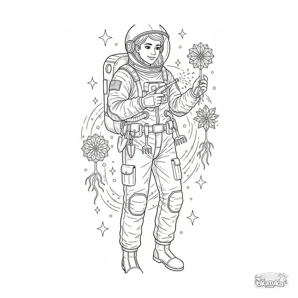 Página para colorear para niños mayores 10-12: un astronauta jardinero cuida plantas cristalinas en el espacio exterior.
