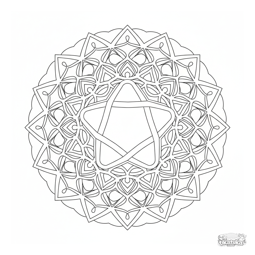 Mandala geométrica intrincada para colorear, para edades 10-12. Estrella central de hexágonos entrelazados, anillos concéntricos de triángulos y diamantes, simetría perfecta.