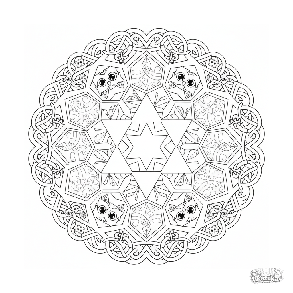 Página para colorear de mandala geométrica intrincada para 10-12 años. Centro de estrella de ocho puntas, anillos de hexágonos, diamantes y nudos celtas. Patrón simétrico.