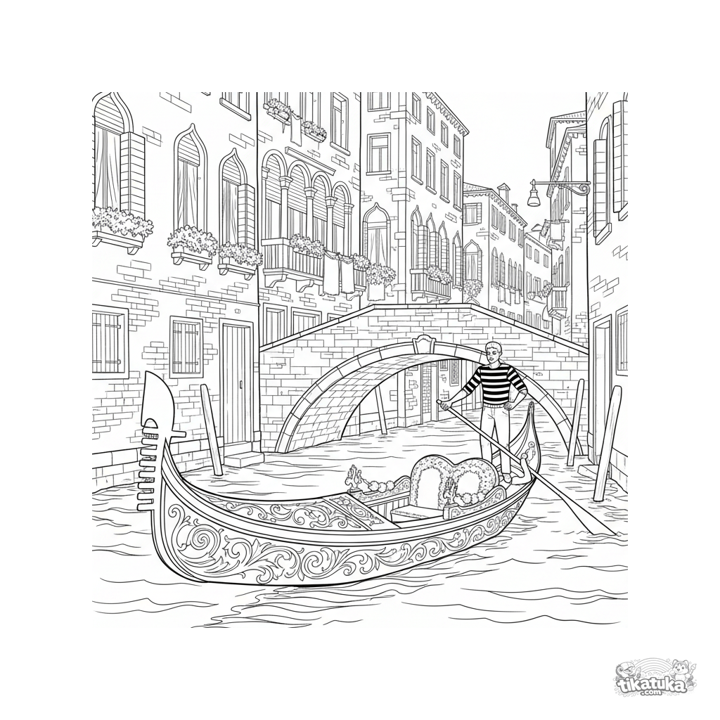 Página para colorear intrincada para niños mayores de 10 a 12 años: una góndola veneciana detallada pasa bajo un puente de piedra.