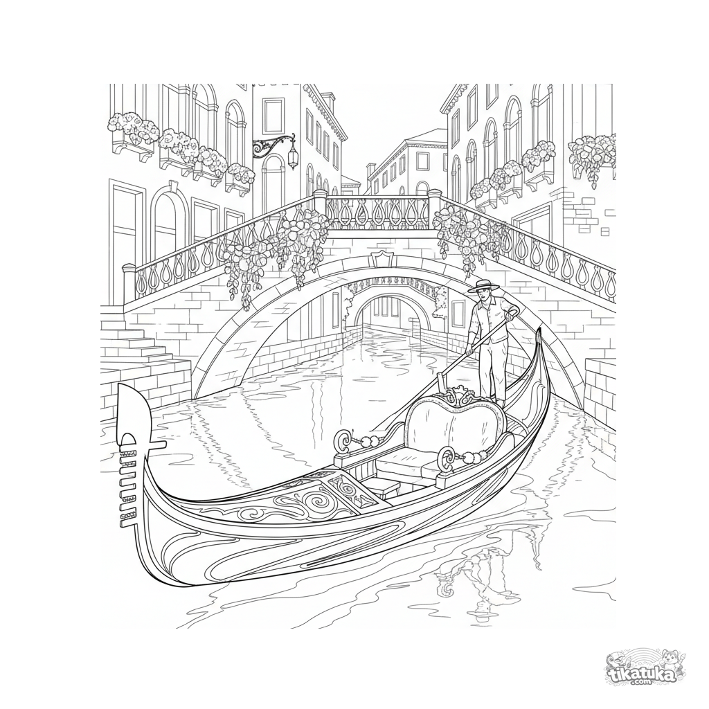 Página para colorear detallada para niños mayores 10-12: una góndola veneciana intrincada se desliza bajo un puente de piedra ornamentado. Muchos detalles decorativos.
