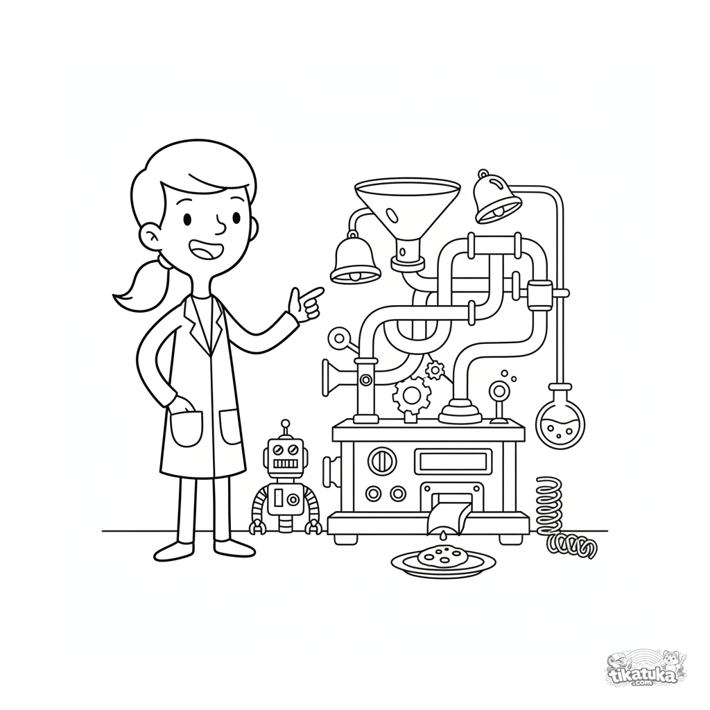 Página para colorear para niños de 7-9 años: un joven inventor presenta con orgullo su divertida máquina dispensadora de galletas.