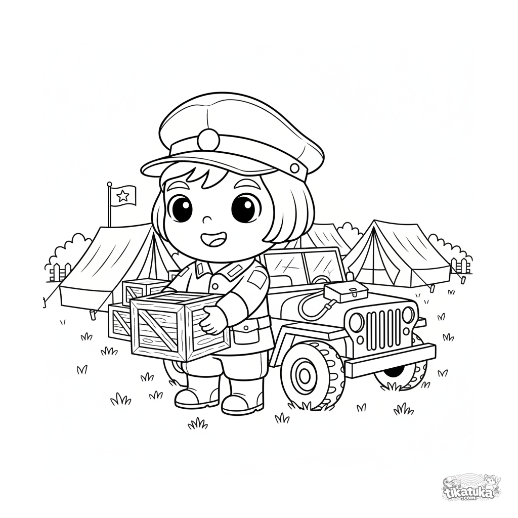 Página para colorear para niños 4-6: un soldado descargando cajas de un jeep militar cerca del cuartel general de campaña con carpas.