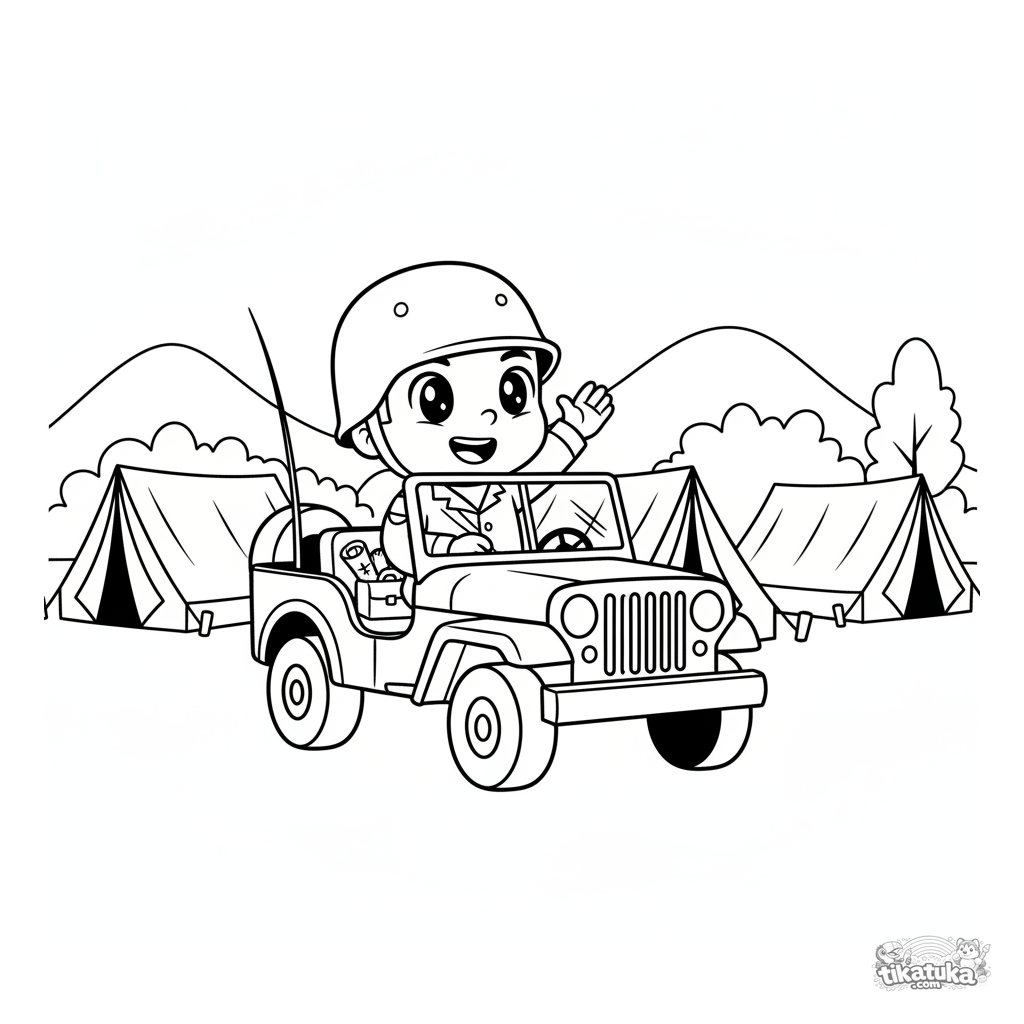 Página para colorear para niños de 4-6 años: un soldado alegre conduciendo un jeep militar cerca del cuartel general de campo con carpas. Contornos limpios y formas simples.