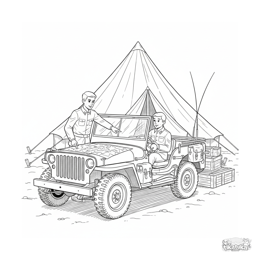 Página para colorear detallada estilo vintage para 10-12 años: un comandante realiza una reunión usando el capó de un jeep como mesa, cerca de un cuartel general de campaña. Líneas de grabado limpias.